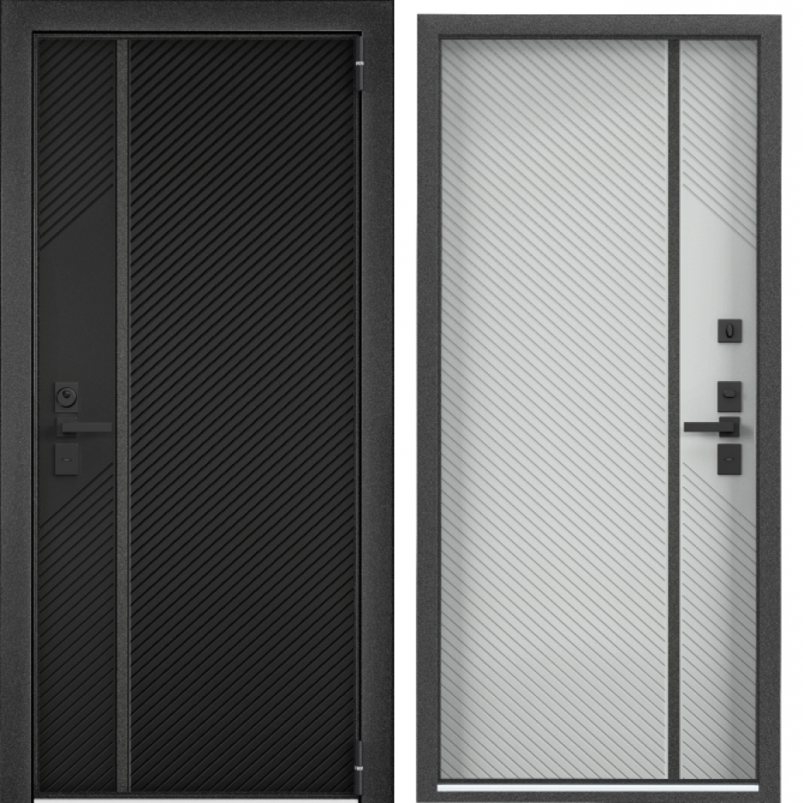 Противосъемные ригеля, девиатор, три контура уплотнения, металлический эксцентрик, глазок с металлической шторкой и широким углом обзора, накладной порог из нержавеющей стали.