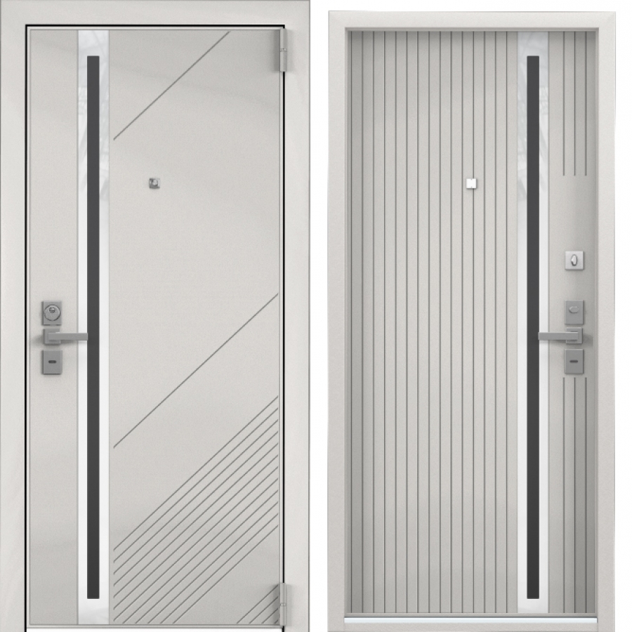 Противосъемные ригеля, девиатор, три контура уплотнения, металлический эксцентрик, глазок с металлической шторкой и широким углом обзора, накладной порог из нержавеющей стали.