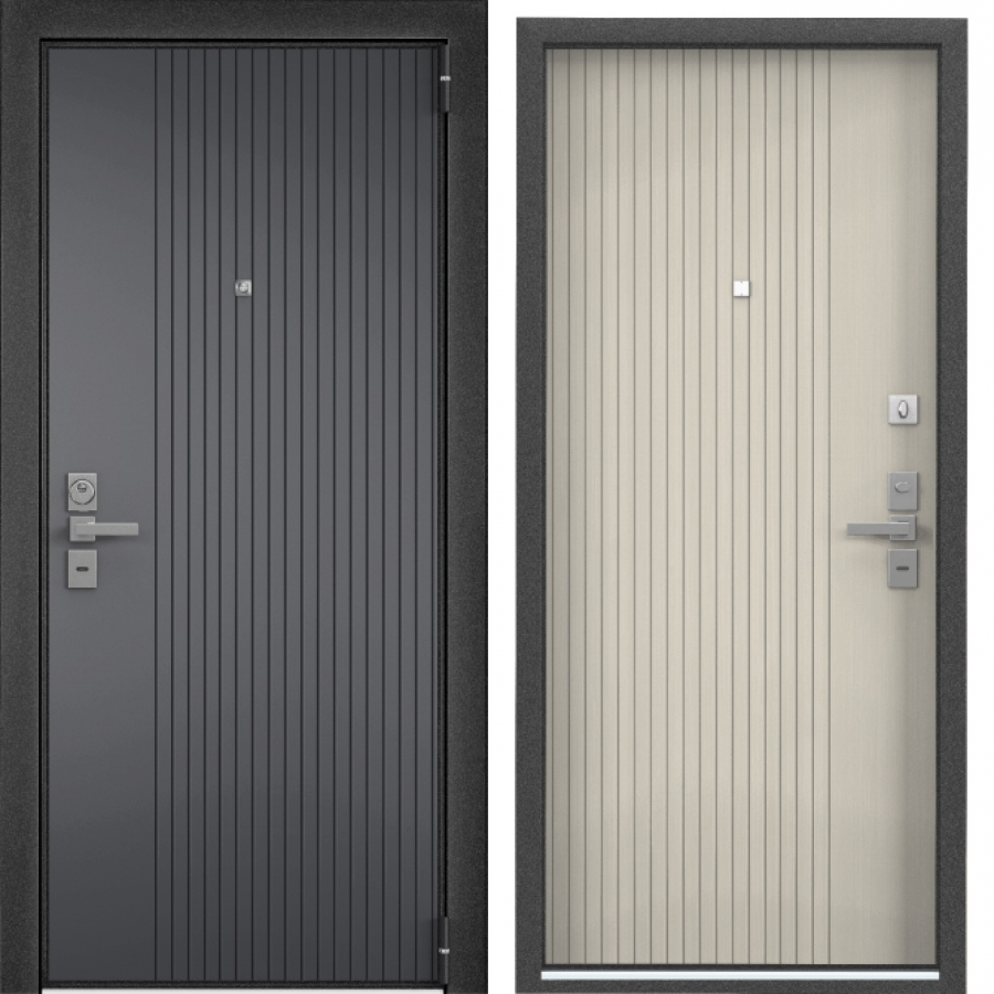 Противосъемные ригеля, девиатор, три контура уплотнения, металлический эксцентрик, глазок с металлической шторкой и широким углом обзора, накладной порог из нержавеющей стали.